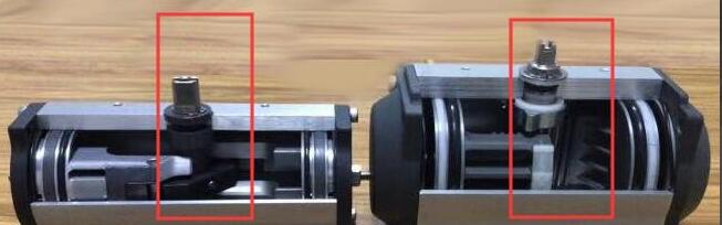 撥叉式氣動執行器(左)和齒輪齒條氣動執行器(右)內部結構區別